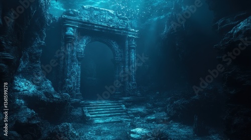 Underwater cave with vibrant marine life illuminated by sunrays in a serene ocean environment