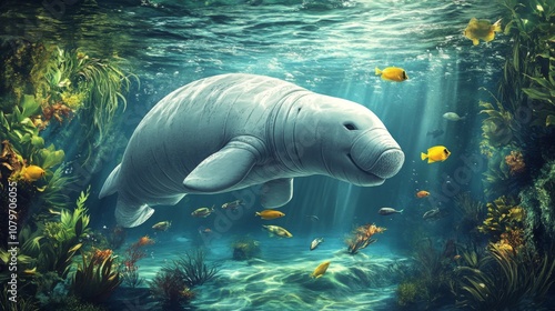 Underwater Scene Featuring a Manatee Surrounded by Colorful Fish and Lush Marine Vegetation, Illustrating the Beauty of Aquatic Life in a Vibrant Ecosystem