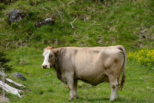une vache laitière dans un un champs en montagne en été dans les Alpes Suisse