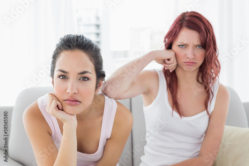 20s, young adult, woman, female, caucasian, indoor, copy space, home, house, apartment, couch, sofa, living room, brown hair, sitting, human relationships, together, argument, challenged, disagreement, angry, unhappiness, unhappy, upset, rift, problem, trouble, fight, arguing, fighting, annoyed, beautiful, casual attire, conflict, crisis, serious, leisure, lifestyle, relaxation, brunette, pretty, attractive, friends, friendship