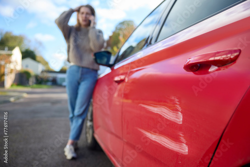 Unhappy Mature Female Driver With Damaged Car After Accident Calling Insurance Company On Mobile Phone
