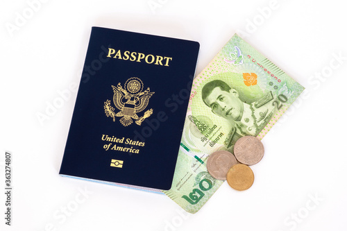 United States passport and Thai baht currency. Concept for rich American tourists spending money in Thailand.