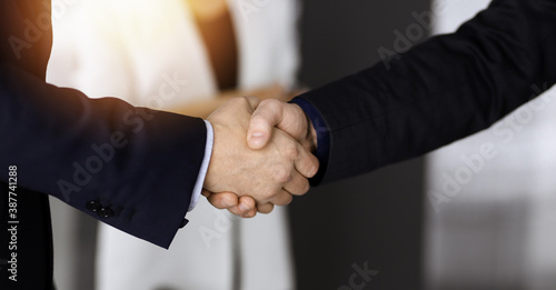 Unknown businesspeople are shaking their hands after signing a contract, while standing together in a sunny modern office, close-up. Business communication, handshake, and marketing concept