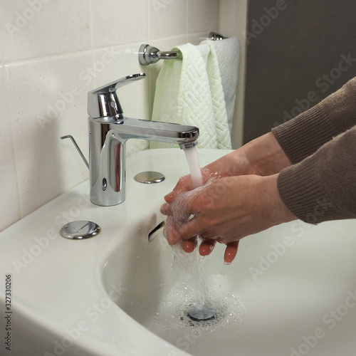 man, washing, hand, carefully, home, health, safety, virus, 19, corona, water, clean, lather, scrub, rinse, dry, infection, faucet, sink, tap, 19, dwelling, house, architecture, building, hygiene