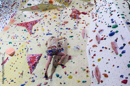 Unrecognizable man climbing wall in bouldering gym