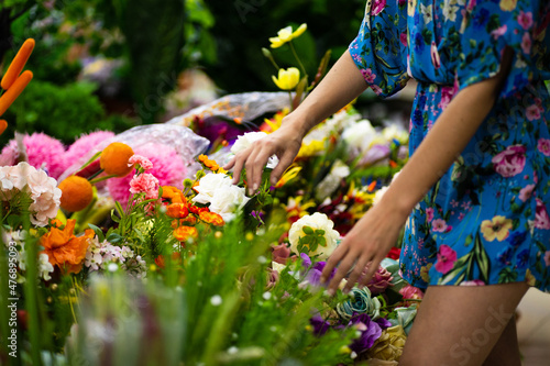 crop, anonymous, woman, caucasian, adult, hat, bucket, straw, floral, florist, shop, colours, high-coloured, store, service, hobby, thoughtful, inside, delivery, cheerful, client, fashionable, choice, client, counter, garden, present, positive, pensive, purchase, romantic, many-coloured, order, standing, income, valentine, decorator, department store, plant, search, look for, distracted, pot, container, shelf, organisation, business, one person