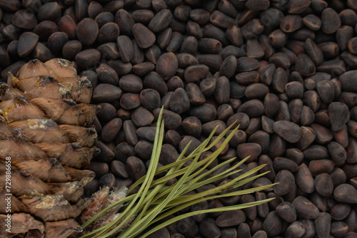 Unshelled pine nuts are scattered on the surface, nearby are cedar cones with frozen resin on them, cedar