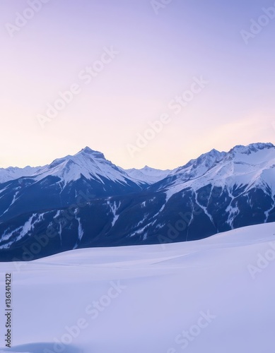 Untamed snowy landscape, mountains under a vast, clear winter sky, remote, serene, landscape