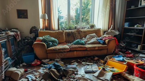Untidy living room featuring a stained sofa, overturned cushions, and a floor littered with toys, books, and trash, chaotic and unkempt interior with a sense of neglect.