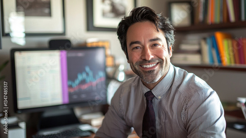 Upbeat man in his 40s with dark hair, wearing a tie, smiling in a home office with a large monitor and organized shelves in the back