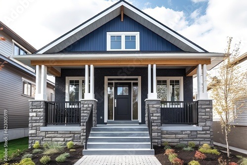 Upscale New Development Home with Avant-Garde Aesthetic, Single Car Garage, Navy Blue Siding, and Natural Stone Porch, generative AI