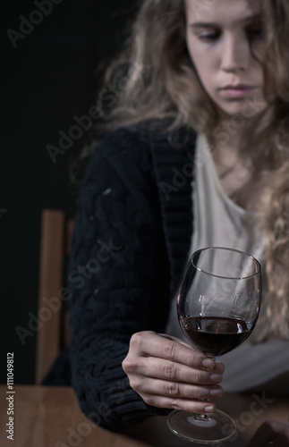 wine, wine glass, glasses, woman, young, blond, alcohol, alcoholic, alcoholism, drunk, sad, upset, depressed, depression, dark, sitting, night, table, indoor, addiction, loneliness, lonely