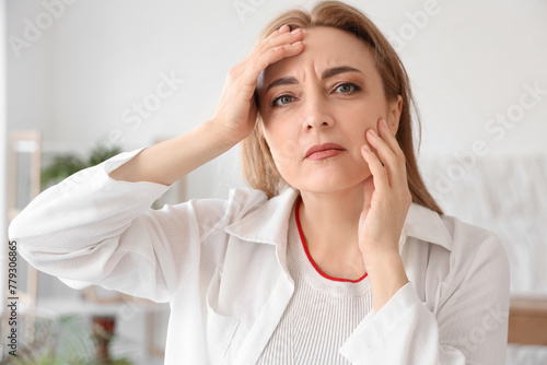 Upset mature woman experiencing menopause at home, closeup