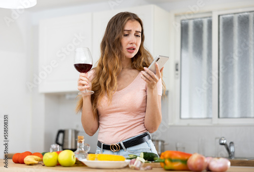 Upset woman with glass of red wine in kitchen reading messages on mobile phone screen