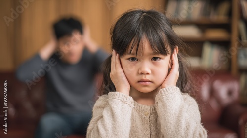 Upset young Asian girl covers her ears during her parents domestic dispute in the living room