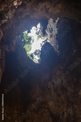 Upward view from inside Batu Caves near Kuala Lumpur, Malaysia. Showing a natural opening in the limestone cave with sunlight and greenery.