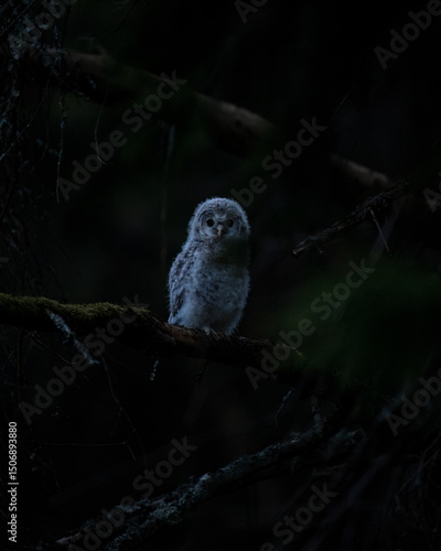 Ural owl owlet in the dark forest