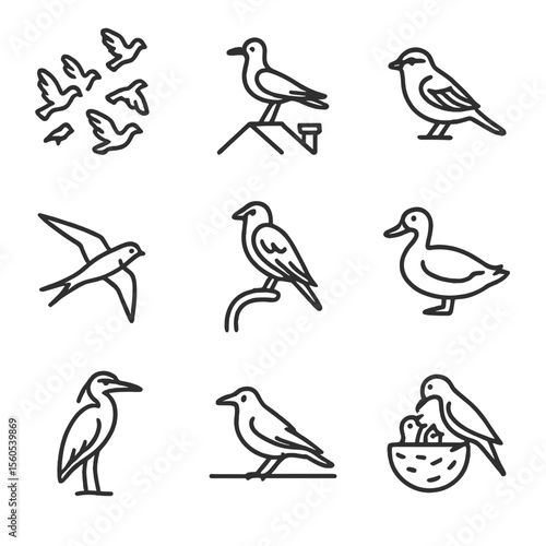 urban, bird, icon, outline, icon, set, life, pigeon, flock, rooftop, seagull, city, sparrow, chimney, swift, hawk, lamp-post, park, duck, night, heron, crow, wire, swallow, nest, line