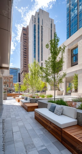 urban, courtyard, modern, seating, greenery, patio, landscape, architecture, building, city, light, roomy, design, contemporary, wood, bench, cushion, plant, tree, concrete, stone, paving, daylight, calm, peaceful, relaxing, fresh, modernism, detail, functional, ambience, comfortable, detailed, exterior, urban living