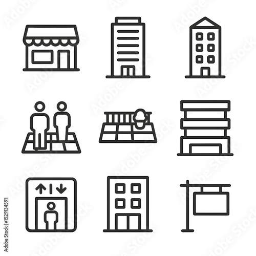 urban, development, icon, outline, icon, set, mixed, use, street, level, retail, office, tower, residential, pedestrian, piazza, rooftop, terrace, parking, garage, elevator, facades, signage, all, grid