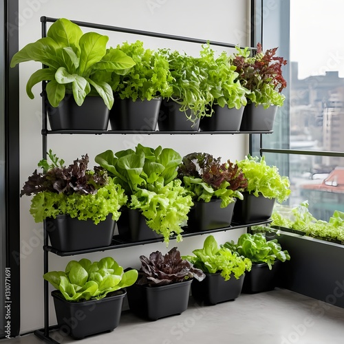 Urban Gardening Fresh Herbs and Lettuce Growing in Modern Vertical Planter