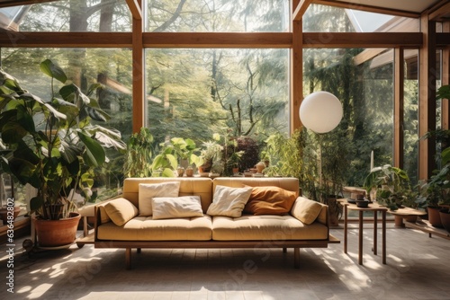 Urban Greenery: A living room with a wooden-framed sofa surrounded by a lush indoor garden, creating a tranquil and refreshing ambiance. Generative AI