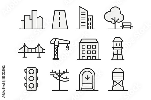urban, icon, collection, development, line, icon, set, city, skyline, road, skyscraper, park, bridge, construction, crane, residential, urban development, city skyline