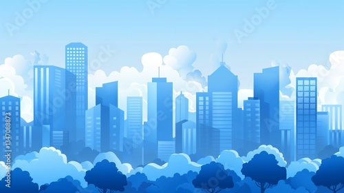 urban landscape in monochrome with clouds overhead. Tree-lined, blue city buildings. Vector illustration of a modern architectural flat style, Generative AI.