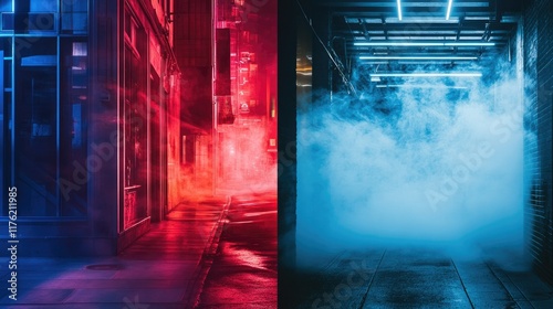 urban, night, neon, light, fog, alley, street, architecture, city landscape, atmosphere, mystery, reflections, colours, illumination, dark, surreal, vibrant, urbanism, nightlife, landscape, texture, shadow, modern, design, creative, background, street light, ambience, cinematic, futuristic, dramatic, space, contrast, blue, red, environment, pattern, aesthetic, surrealism, visual, scene, artsy, photograph, dynamic, composition, colours, beauty, foggy, depth