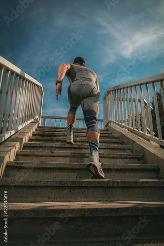 man, running, stair, physical exercise, relaxation, urban, sport, sportsman, jogging, exercising, city life, bridge, athlete, exercise, healthy, lifestyle, activity, training, backview, vertical