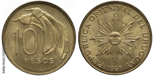 Uruguay Uruguayan coin 10 ten pesos 1969, value below flower, radiant sun in centre, date below,