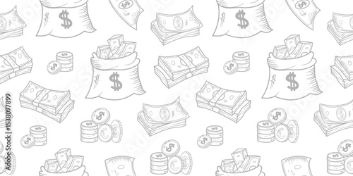 money, dollar, doodle, pattern, background, finance, cash, coin, bill, currency, wealth, prosperity, income, saving, investment, banking, economy, rich, symbol, icon, vignetting, drawing, art, motif, texture, design, graphic, illustration, repeat, seamless, digital, visual, concept, element, line, hand, style, creative, modern, playful, fun, success, growth, value, exchange, capital