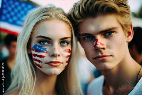 USA Independence Day: couple of young people with faces painted in red, white and blue colors