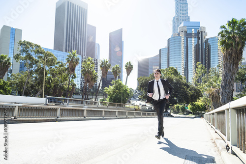 business, businessman, suit, run, race, fast, city, urban, stress, underway, move, architecture, building, tower, skyscraper, heaven, sunshine, bridge, tree, palm, haste, punctuality, appointment, bustle, city centre, way, sidewalk, businessman, downtown, man, man, us, california, los angeles, move, hasty, stressed, on time, young, outside, outdoors, european