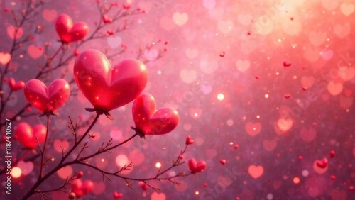 Valentines day background with A bunch of red hearts are hanging from a tree branch. The background is pink and has a blurry effect. Concept of love and warmth