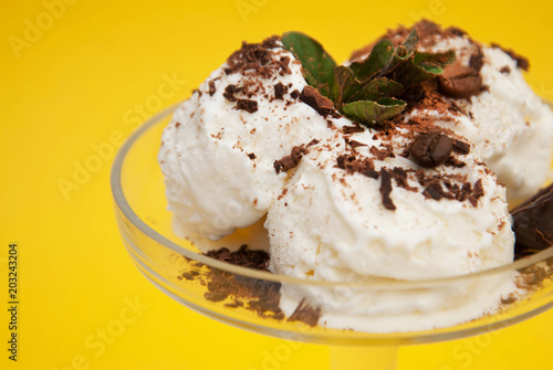 Vanilla Ice Cream with Chocoalte Topping Scoop in cup on Summer Yellow background