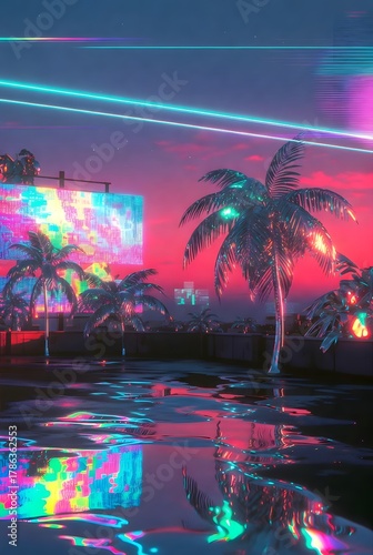 Vaporwave city rooftop with neon palm trees and digital reflections