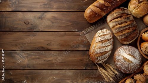 Variety of bread loaves on a wooden surface, copy space