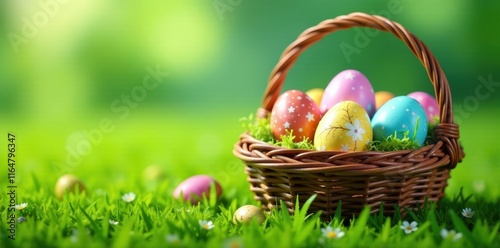 Variety of decorated eggs in wicker basket & on lush green grass, decorated, design, painted