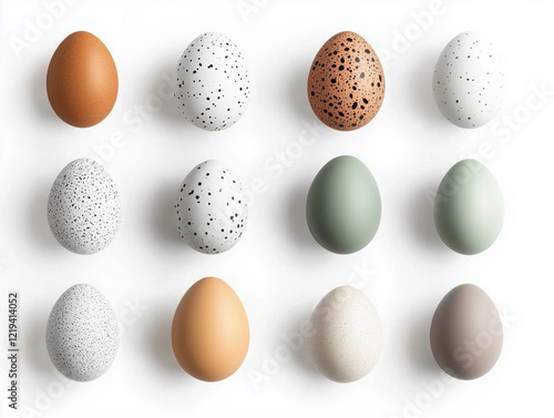 Variety of Eggs: Diverse Colors and Patterns Showcased on a White Background in a Grid Layout