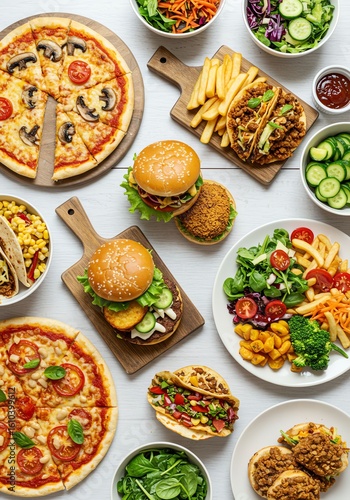 Variety of Fast Food Items Including Pizza Burgers Salads and Fries on White Surface