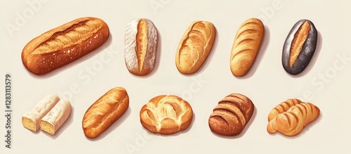 Variety of freshly baked breads and baguettes in warm golden and brown hues arranged neatly on a light beige background perfect for food lovers