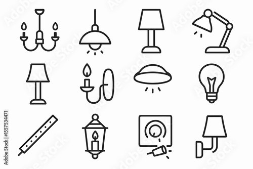 lamp, lighting, fixture, chandelier, desk, wall, ceiling, line, bulb, lantern, modern, minimal, electric, design, home, interior, decor, light bulb, stylish, outline, symbol, illustration, collection, set, graphic, simple, art, clean, vector, icon