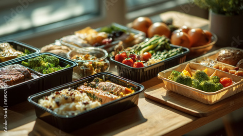 container, indoor, food, healthy, broccoli, tomatoes, asparagus, rice, salmon, meat, lunch, dinner, nourishment, diet, vegetable, convenience, take-out, window, sunlight, plant, dish, cookery, table, still life, arrangement, meal, eating, fresh, delicious, assortment