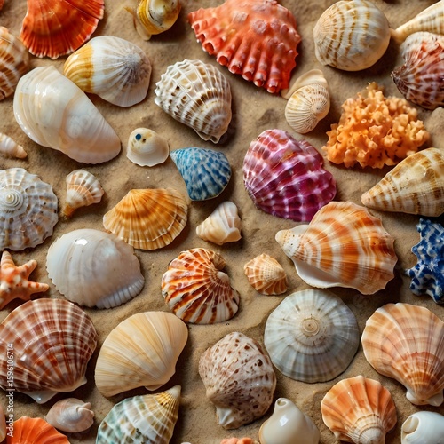 Various colorful seashells and small corals arranged aesthetically on a light sandy background, high-resolution macro details, beach vibe, no people,Generative Ai