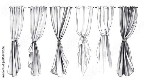 curtain, drape, window, treatment, fabric, home, decor, interior, design, style, white, grey, hanging, tied, pleated, fold, texture, elegant, modern, classic, room, bedchamber, living, kitchen, bathroom, textile, material, soft, luxury, apartment, house, building, vignetting, drawing, illustration, pattern, decoration, blind, shades, space, art