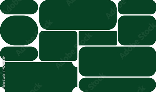 Various dark green rounded rectangles and a circle create a playful geometric pattern on a white field