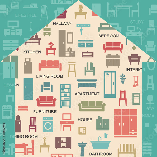 Various home furniture silhouette icons in a house shape 1..Easy editable, with isolated furniture silhouette icons pattern in background.