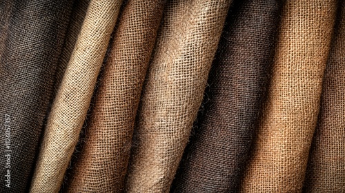 Various Shades of Natural Burlap Fabric Displayed in an Artistic Arrangement for Textural and Color Inspiration in Design Projects