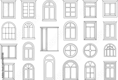 window, architectural, design, element, frame, glasses, pane, opening, building, structure, exterior, interior, white, black, line, art, drawing, vignetting, graphic, illustration, collection, variety, shape, style, home, vector, set
